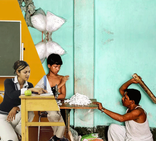Par exemple, une scène de guerre peut se retrouver juxtaposée à une image de défilé de mode, ou un enfant réfugié peut apparaître en parallèle d’un enfant jouant sur une plage touristique.